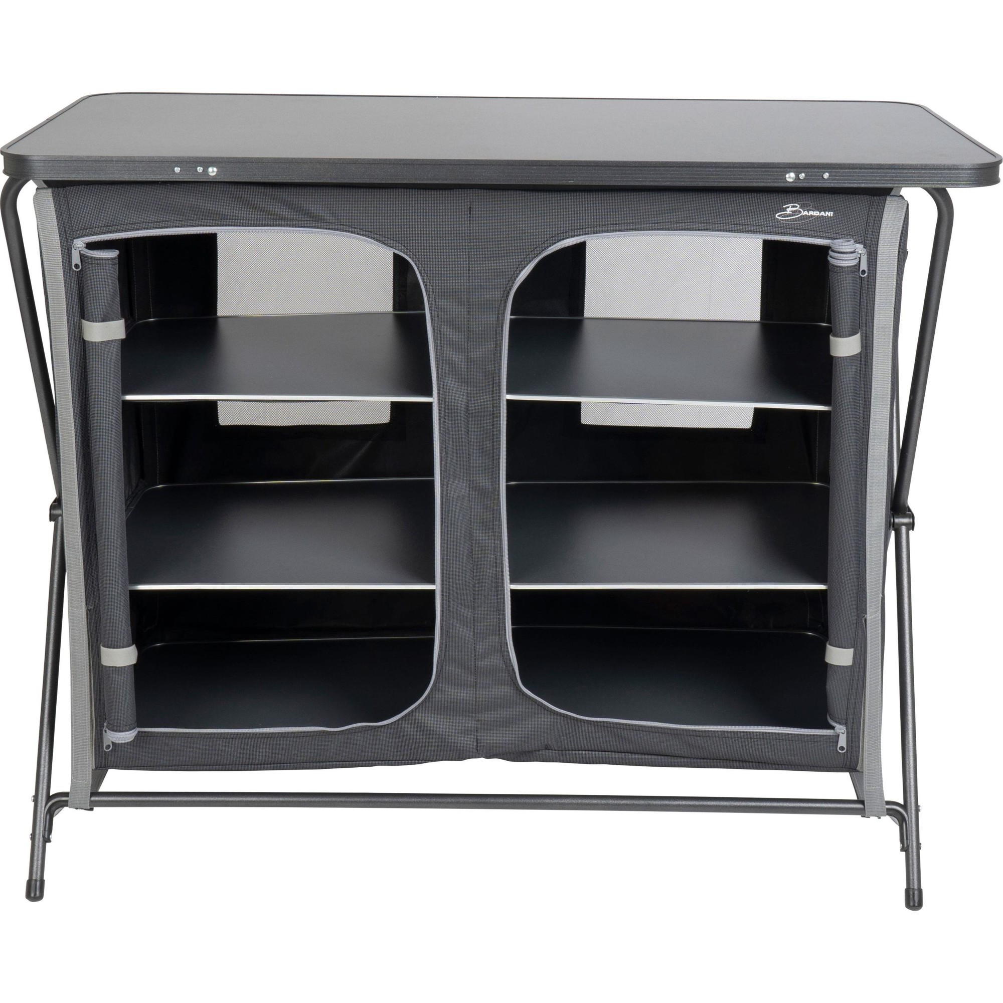 De Bardani Ripiani X6 campingkast is uitgevoerd met een grijs 600 D polyester doek. Daarnaast heeft de Bardani campingkast een aluminium frame en een MDF blad. Dankzij dit blad kunt u naast spullen in de kast ook spullen op de kast leggen. De kampeerkast heeft in totaal 6 schappen.