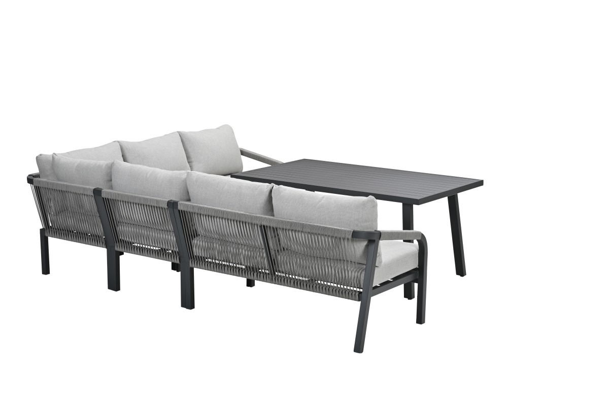De afmetingen van de lounge-diningset zijn 278,5 x 213,5 x H70 cm, met een zithoogte van 49 cm. De tafel meet 147 x 85 x H68 cm.