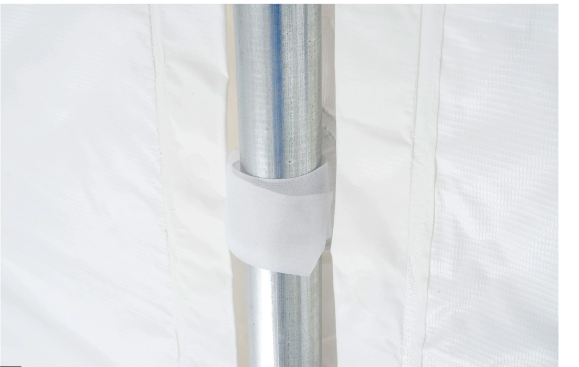 Het dak en de zijwanden zijn uitgevoerd in PVC, een stevig en onderhoudsvriendelijk materiaal dat goed bestand is tegen regen en gemakkelijk droog te maken is. De witte kleur reflecteert zonlicht en geeft een frisse, neutrale basis voor elke styling. Het frame bestaat uit gegalvaniseerde stalen buizen met een diameter van 38 mm. Galvanisatie beschermt tegen roest en, in combinatie met het totaalgewicht van 103 kg, zorgt dit voor een stabiele opstelling wanneer u de tent correct verankert op een vlakke, stevige ondergrond.